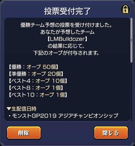 モンスト 優勝 予想 できない- これで優勝チーム予想のミッションが完了となり、投票の報酬としてオーブ1個入手することができます。 ミッションの注意事項 注意事項 ・ミッションは1人1回しか参加できない ・ミッション完了後に予想チームを変更できない ・ランク50以上でないと参加できない 7/1011に行われるモンストグランプリ21の優勝予想をくまさん、ぴよまるとやっていきました。 今回もモンスト内で優勝予想ミッションなどあると思いますので参考にどうぞ! モンストグランプリ21特設サイト https//esportsxflagcom/games/grandprix/21/japanchampionship/ ゲスト くま https//twittercom/kumasan_MNST